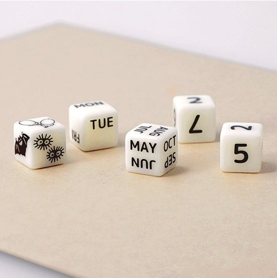 An additional die represents special characters and objects from the film. You can display the date by turning the dice to the right side. Unless you are in a magical spirit world outside of time, you can use this calendar every year!